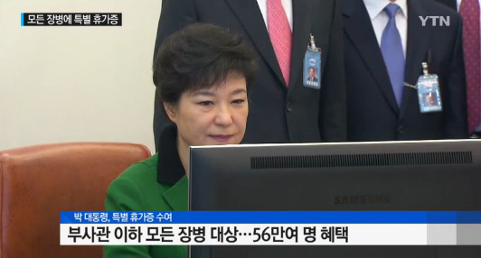 박근혜 대통령이 추석을 맞이해 부사관 이하 모든 국군장병들에게 1박2일의 '특별휴가증'과 격려카드, 특별간식을 수여한다.