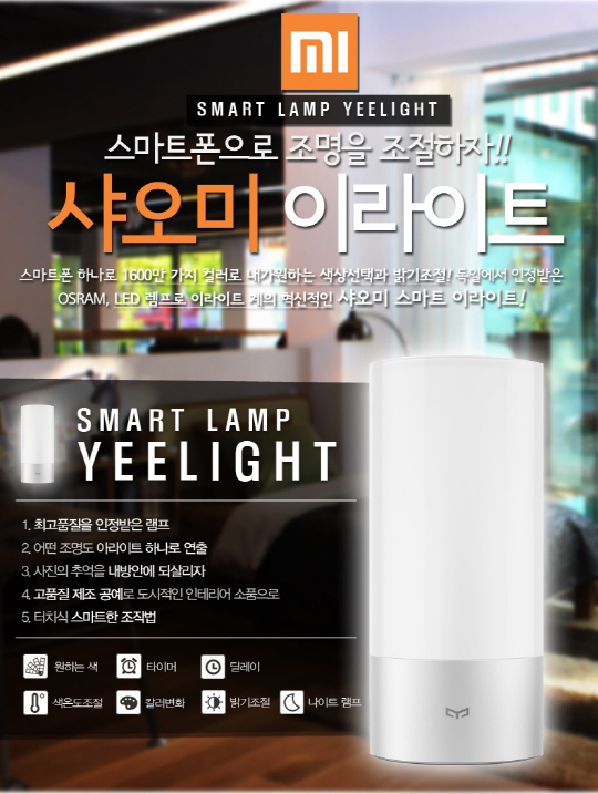샤오미 스마트 LED 스탠드인 '이라이트'는 1600만가지의 조명 색상을 선택할 수 있을 뿐 아니라 독일의 오스람 램프 기술로 사용 수명이 2만 시간에 달하는 뛰어난 기능과 내구성을 겸비한 제품이다. 스마트폰에서 전용 애플리케이션으로 전원은 물론 밝기와 색상 등 모든 기능을 조절할 수 있다. 보조배터리와 블루투스 스피커에 이은 샤오미의 새로운 스마트 소품으로 얼리어답터 소비자들 사이에 이미 유명한 제품이다.