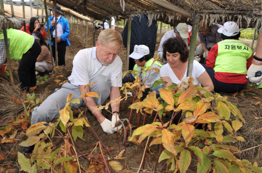 풍기인삼축제에 참가한 외국인들이 인삼캐기 체험에 나서고 있다.