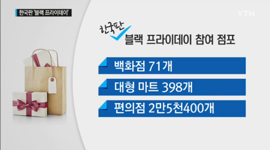 한국판 블랙 프라이데이 행사에는 백화점 71개, 대형 마트 398개, 편의점 2만5400개 등 대형 유통업체 2만6000여 점포가 참여한다. 전국 200개 전통시장과 온라인 유통업체 16곳, 외식 프랜차이즈 업체들도 함께 한다. 업체별로 최대 50-70% 할인율이 적용되며, 국내 모든 카드사는 최대 5개월 무이자 할부를 제공한다.