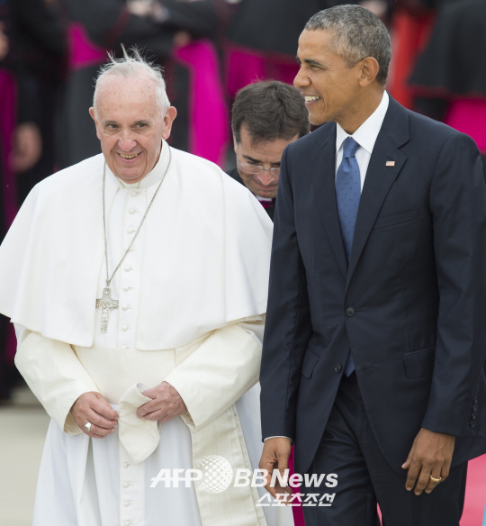 교황 전용기가 22일(현지시간) 오후 3시50분께 워싱턴D.C. 인근 메릴랜드 주 앤드루스 공군기지에 도착했다. 교황의 역사적인 생애 첫 미국 방문에 버락 오바마 대통령과 조 바이든 부통령 내외가 전용기에서 내려오는 교황을 직접 영접했다.