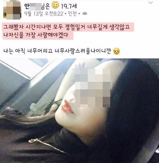 최근 온라인 상에 공개된 A양의 SNS 글은 "그래봤자 시간지나면 모두 경험일 거 너무깊게 생각않고 나자신을 가장 사랑해야겠다. 나는 아직 너무어리고 너무 사랑스러울 나이니깐"이라는 내용이다.