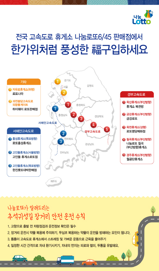 만약 분주한 귀향길 로또 명당을 방문할 시간이 부족하고 평소처럼 복권을 구매하지 못했다면 고속도로 휴게소 판매점을 소개한 '로또 지도'를 챙겨두자. 이색적인 장소에서 우연히 구매한 로또 복권이 한가위의 행운을 안겨줄지도 모른다.