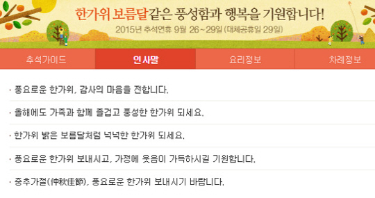 주로 쓰이는 인사로는 '풍요로운 한가위, 감사의 마음을 전합니다' '올해에도 가족과 함께 즐겁고 풍성한 한가위 되세요' '한가위 밝은 보름달처럼 넉넉한 한가위 되세요' '풍요로운 한가위 보내시고, 가정에 웃음이 가득하시길 기원합니다' '중추가절(仲秋佳節), 풍요로운 한가위 보내시기 바랍니다' 등이 있다.