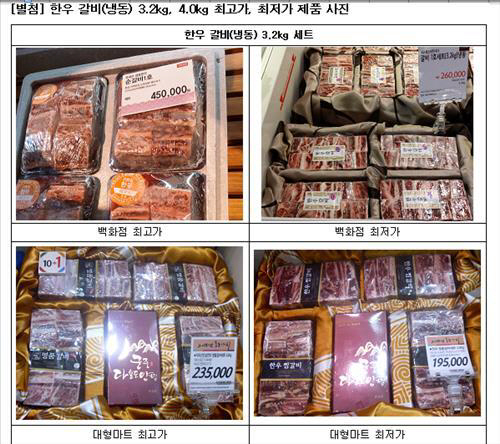 한우갈비 마트보다 백화점이 33% 비싸…3.2kg세트 10만원 이상 차이