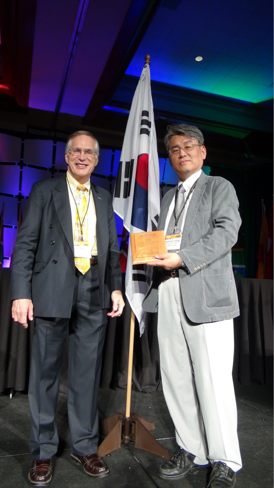 2015피너클어워드에서 세계축제협회 한국지부 정강환 회장(오른쪽)이 세계축제협회 스티븐 슈메이더 회장으로부터 피너클 어워드 교육부문 금상을 수상한 뒤 포즈를 취하고 있다.