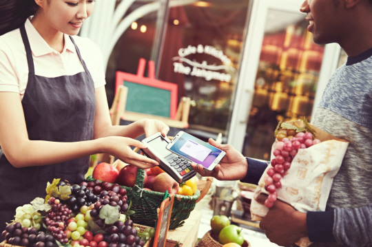 29일 삼성전자에 따르면 삼성페이는 신용카드를 긁는 대신 스마트폰을 카드 결제기에 터치해 사용하는 모바일 결제 서비스로 MST(Magnetic Secure Transmission, 마그네틱 보안 전송)와 NFC(Near Field Communication, 근거리 무선통신)를 모두 지원해 기존 대부분의 가맹점에서 카드 결제기의 교체 없이도 결제가 가능하다.