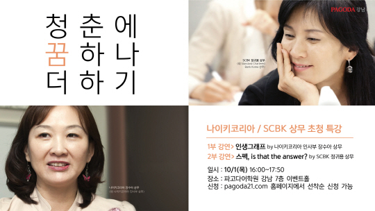 외국어 전문 교육기관 파고다아카데미(대표이사 박경실, www.pagoda21.com)가 10월 1일 오후 4시, 파고다어학원 강남 7층 이벤트 홀에서 지난해에 이어 '청춘에 꿈 하나 더하기' 특강 2회를 개최한다.