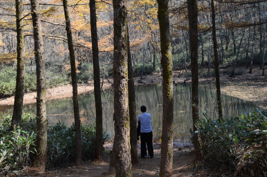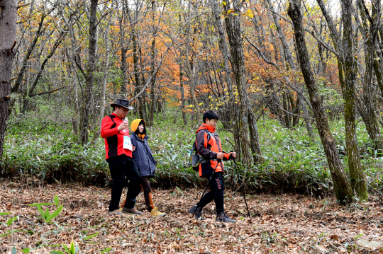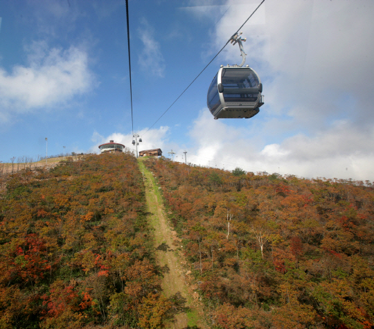 하늘길 코스는 지난해부터 선보인 하늘마중길을 걷게 된다. 마운틴베이스 앞 잔디광장을 출발해 처음 만나게 되는 하늘마중길은 호젓한 숲길의 묘미와 가을 정취를 만끽하기에 그만이다. 이곳에는 9월 하순부터 본격적으로 가을색이 내려앉기 시작했다. 노란 자작나무며 싸리나무, 신갈나무, 붉은 단풍나무, 옻나무 등 다양한 수종의 활엽수가 어우러져 화려한 가을빛깔을 뽐낸다. 도롱이연못까지는 3.6km, 7~8부 능선 높이의 한적한 숲길로 온 가족이 무난하게 트레킹을 즐길 수 있다.
