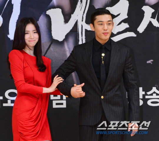 9월 30일 서울 목동 SBS사옥에서 SBS 창사 25주년 특별기획 드라마 '육룡이 나르샤' 제작발표회가 열렸다. 제작발표회 무대에서 다정하게 포즈를 취하고 있는 유아인과 신세경. 목동=송정헌 기자 songs@sportschosun.com/2015.09.30