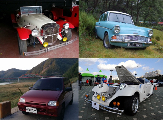 제3회 클래식엔카 페스티벌 전시 차량. 왼쪽 상단부터 시계방향으로 1929년식 벤츠 가젤, 1963년식 포드 앵그리아, 1992년식 미쯔오카 라세드, 1992년식 대우 티코.