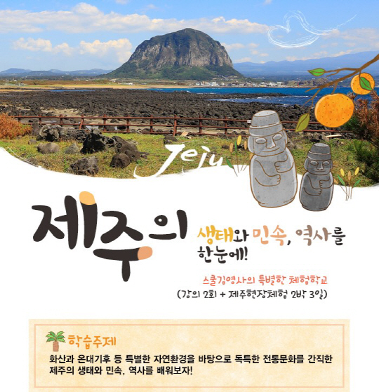 이번 체험학습은 화산과 온대기후 등 특별한 자연환경을 바탕으로 독특한 전통문화를 간직한 제주의 생태와 민속, 역사에 대해 알아보는 프로그램이다. 첫째 날에는 민속자연사박물관을 방문해 제주도의 자연과 생활 모습에 대해 배운다. 이후 삼성혈로 이동해 제주도의 설화와 역사 등을 배우며 제주의 뿌리를 찾아본다. 국내 최초로 유네스코에 세계지질공원으로 인증된 산방산에서는 제주도만의 특수 지형인 오름을 탐방하고 탄산온천을 체험하는 시간을 갖는다.