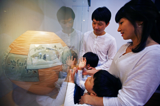 분청도자관에서 물고기가 새겨진 분청도자기를 보고 있는 가족의 모습.