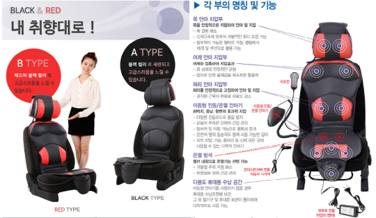 상표등록증 등 다량의 특허 및 인증서를 보유하고 있는 온열 진동지압 안마시트커버 '부루루-TOUCH'는 신체 각 부위에 다양한 진동을 전달해 심각한 교통사고 원인인 졸음운전을 막아준다. 이동식 마사지기 '팡팡이'를 사용해 원하는 부위를 부분적으로 마사지할 수 있으며 조수석과 뒷좌석까지 부분 마사지가 가능하다. 모든 차종에서 12Vㆍ24V로 사용할 수 있으며 탈부착과 이동이 편리하다.