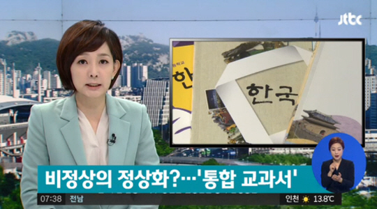 JTBC는 9일 "정부 여당이 국정교과서 대신 통합교과서라는 표현을 쓰고 있다"라고 소개했다.