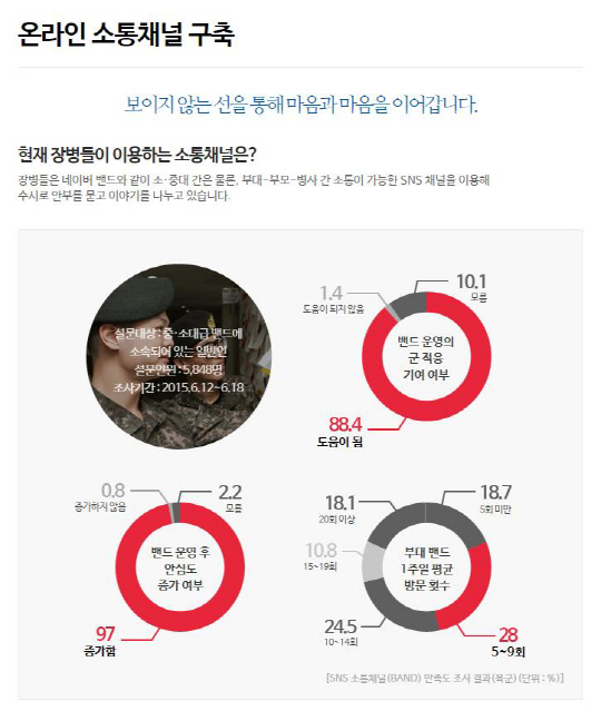 육군이 실시한 '육군밴드 만족도 조사' 결과에 따르면, 육군밴드가 군 생활 적응에 도움이 됐다고 응답한 비율이 88%, 군생활에 대한 안심도가 증가했다고 응답한 비율이 97%로 나타났다. 밴드가 군부대 소통 창구로 활성화되면서 가족들이 장병들의 군생활을 더욱 안심할 수 있게 되는 등 병영문화 혁신에도 기여하고 있음을 확인할 수 있다.