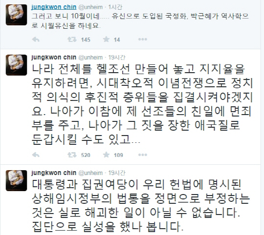 진중권 교수는 "나라 전체를 '헬조선' 만들어 놓고 지지율을 유지하려면, 시대착오적 이념전쟁으로 정치적 의식의 후진적 층위들을 집결시켜야겠지요. 나아가 이참에 제 선조들의 친일에 면죄부를 주고, 나아가 그 짓을 장한 애국질로 둔갑시킬 수도 있고"라며 정부와 새누리당의 한국사 교과서 국정화 방안을 정권과 이념 유지를 위한 꼼수라고 비난했다.