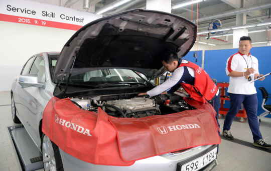 | 자체 기술 서비스 인력의 실력 향상을 통해 고객에 대한 서비스 만족도를 높이기 위해 혼다코리아가 매년 실시하고 있는 '서비스 스킬 컨테스트' 모습 . |