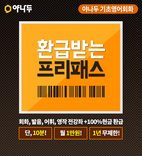 중도 포기없이 한번 꾸준하게 영어공부를 해보겠다는 마음 먹었거나, 하나의 강의로 회화부터 발음, 작문까지 효율적으로 공부할 수 있는 영어회화공부법을 찾고 있다면 야나두 프리패스로 현금 환급도 받고 365일 무제한 수강하며 영어회화 실력도 향상시켜 보자. 야나두 프리패스에 관한 자세한 설명은 야나두 홈페이지 (http://www.yanadoo.co.kr/)를 통해 확인 가능하다.