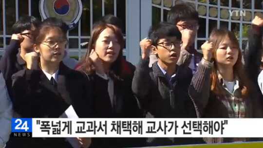 이들은 이날 오후 3시쯤부터 '박근혜 국정교과서를 인정할 수 없다'는 내용이 담긴 플래카드를 들고 이순신상 위에 올라가 점거한 뒤 "국정교과서를 철회하라" 등의 구호를 외친 것으로 전해졌다.