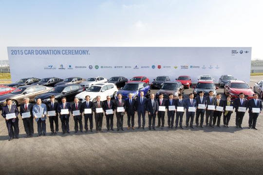 BMW 그룹 세일즈&마케팅 이안 로버슨 총괄 사장, BMW 코리아 김효준 사장, BMW 그룹 아시아 태평양 남아프리카 헨드릭 본 쿠엔하임 총괄 사장과 자동차 관련 대학교와 고등학교 관계자 20명이 기증 차량 앞에서 포즈를 취하고 있다.