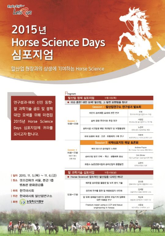 한국마사회가 내달 5~6일 경기도 과천의 렛츠런파크서울에서 '말산업 현장과의 상생에 기여하는 호스 사이언스(Horse Science)'를 주제로 2015년 호스 사이언스데이 심포지업을 개최한다. 이번 심포지엄은 마사회 산하 말산업연구소가 주관하고 농림축산식품부가 후원한다. 심포지엄에서는 연구성과 및 해외 선진 동향, 말 과학기술 공유 및 정책 대안 등을 모색한다. 영국, 독일 등 말산업 선진국 전문가를 포함한 국내 말 관련 학계 및 연구계 전문가가 주제발표와 패널토론에 참여하는 형태로 개최될 예정이다.