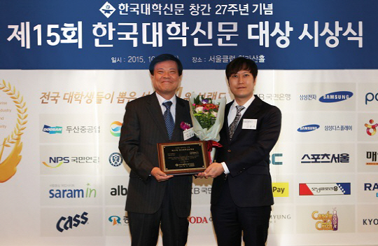 15일 서울클럽에서 열린 '2015 한국대학신문 대상' 시상식에서 사람인HR이 대학생이 선호하는 취업사이트 1위를 차지했다. 사진 왼쪽은 한국대학신문 박성태 발행인, 오른쪽은 사람인HR 김종석 팀장. 사진제공=사람인HR