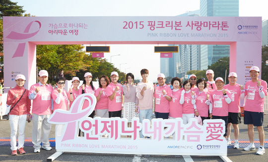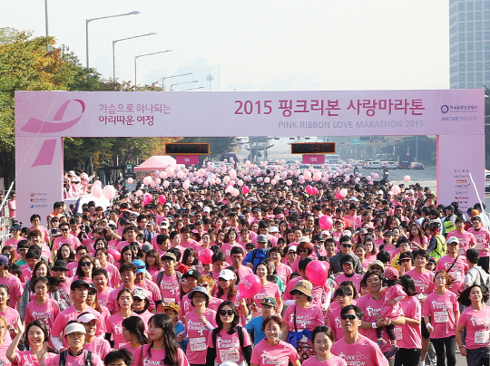 아모레퍼시픽(대표이사 서경배)이 주관하고 한국유방건강재단(이사장 노동영)이 주최한 '2015 핑크리본 사랑마라톤'의 서울대회가 10월 유방건강의 달을 맞아 18일 서울 여의도공원에서 성황리에 개최됐다.