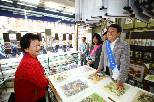 ◇한국관광공사 정창수 사장(사진 오른쪽 첫번째)이 서울 인사동 상점을 방문, K스마일 캠페인을 홍보하고 있는 모습. 정창수 사장 옆이 한경아 한국방문위원회 사무국장.<사진=한국관광공사 제공>