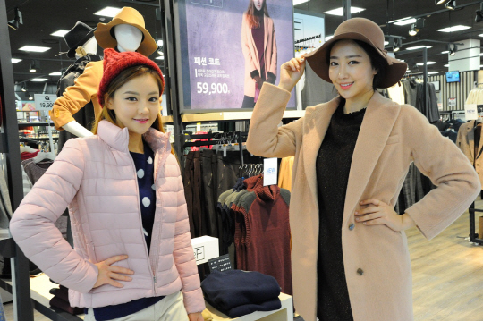 여성용 코트와 패딩점퍼는 다양한 핏과 기장감을 사용했다. 올해는 특히 트렌디한 박시핏과 부드러운 코튼컬러(블랙, 베이지, 핑크)를 사용해 여성스러움을 강조한 박시핏 코트(7만9900원)가 인기 있을 것으로 예상된다. 패딩점퍼이면서도 슬림한 핏을 강조해 한겨울에도 핏감을 살릴 수 있는 슬림아웃터도 다양하게 출시했다. 여성복 아우터류는 모두 11가지 스타일로 가격은 패딩조끼 2만9900원부터 7만9900원이다.