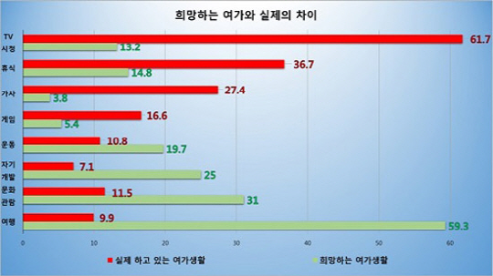 2015년 서울시가 조사한 '통계로 본 서울시민 여가문화생활'을 보면 사람들은 주말을 이용한 여가 시간에 대부분 여행을 희망하지만 실제론 TV 시청으로 시간을 보내는 것으로 조사됐다. 그럼에도 현재 줄이고 싶은 여가 활동으로 사람들은 'TV 시청', '게임', '인터넷' 등을 답했다고 한다. 답답하고 바쁜 생활에서 벗어나 모처럼 여유를 즐길 수 있는 주말이지만, 현실은 'TV' 그리고 '스마트폰' 앞인 것이다.