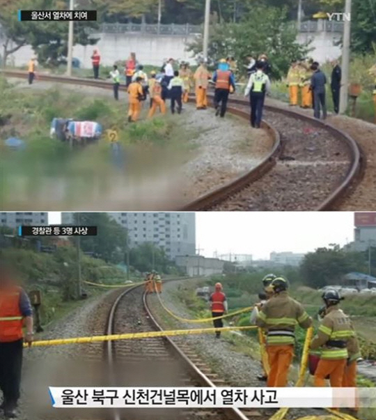 울산시소방본부와 울산경찰청에 따르면 이날 낮 12시께 울산시 북구 신천동 철길에서 경주역에서 울산 태화강역 방향으로 달리던 화물열차(Y3091)에 경주경찰서 내동파출소 소속 이모(57) 경위, 김모(45) 경사, 정신지체장애 2급 김모(16)군 등 3명이 치였다.
