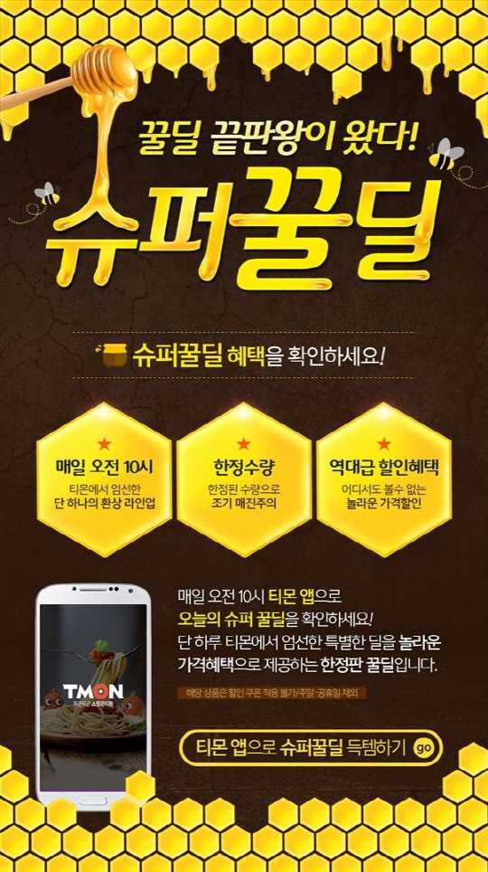 티켓몬스터(대표 신현성)가 운영하는 국내 대표 소셜커머스 티몬(www.tmon.co.kr)이 연말까지 50여종의 인기 상품들을 매일 한 가지씩 최대 80% 추가 할인해서 판매하는 '슈퍼꿀딜'을 선보인다.