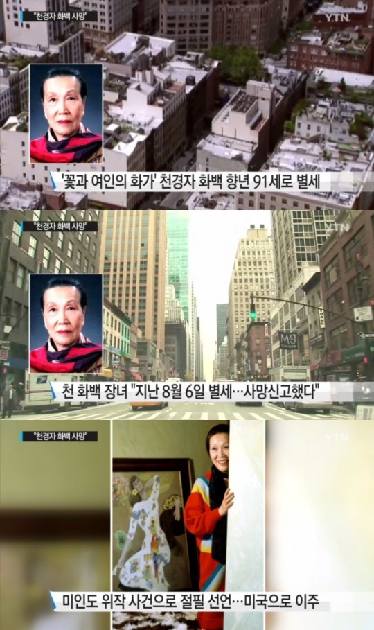 그러나 승승장구하던 천경자 화백은 1991년 '국립현대미술관 미인도 위작 사건'으로 절필선언하며 미국으로 떠난 뒤 1998년 11월 일시 귀국해 작품 93점을 서울시립미술관에 기증했다. 이후 딸과 함께 미국 뉴욕에 머물던 천 화백은 2003년 뇌출혈로 쓰러져 외부 활동을 중단했다. <스포츠조선닷컴>