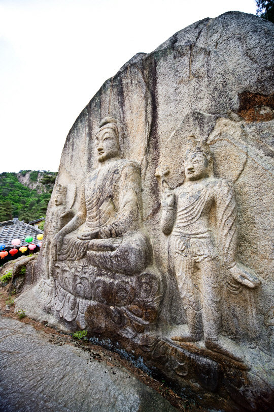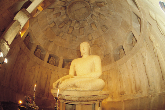 석굴암의 중심은 부처의 세계를 나타내는 주실의 본존불이다. 본존불은 앉은키가 3.5m에 이르는 거대한 불상이다. 눈을 감고 엷은 미소를 띤 자비심 느껴지는 표정은 생불을 대하는 듯 착각을 불러일으킬 정도다. 불상의 부드러운 곡선미는 전체적로 편안하고 여유로운 느낌을 전한다. <사진=한국관광공사 제공>