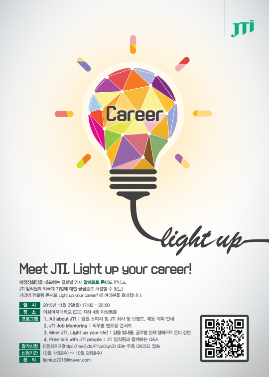 글로벌 담배 기업 JTI코리아는 11월 2일 오후 5시 이화여자대학교 ECC 지하4층 이삼봉홀에서 커리어 멘토링 콘서트 'Meet JTI, Light up your career'를 개최한다고 밝혔다.
