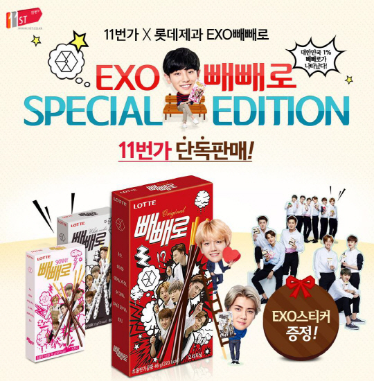 SK플래닛 11번가(www.11st.co.kr)가 11월 11일 '빼빼로데이'를 앞두고 온라인몰 최초로 인기 아이돌그룹 EXO를 모델로 활용한 'EXO 빼빼로'를 한정수량 단독 판매한다.