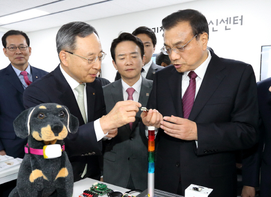 황창규 KT회장이 리커창 총리에게 경기창조경제혁신센터 보육기업인 울랄라랩의 위콘(WICON) 서비스를 설명하고 있다.