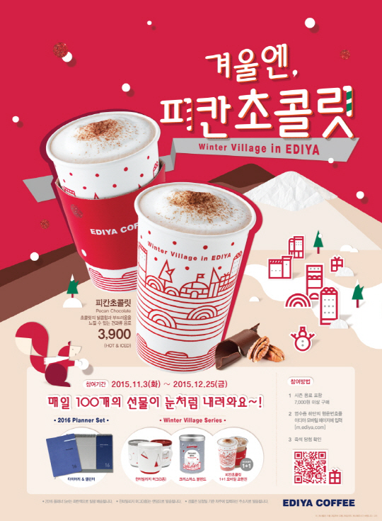 이벤트 기간은 크리스마스인 다음달 25일까지이며, 매일 100명에게 경품을 증정할 예정이다. 특히, 이번 이벤트 경품으로는 겨울 시즌 동안 한정판매 되는 이디야커피 2016년 다이어리·캘린더 세트, 겨울 시즌 머그(3종), 겨울 시즌 원두(크리스마스 블렌드), 피칸 초콜릿 1+1 모바일 교환권 등이 제공된다.전상희 기자 nowater@sportschosun.com
