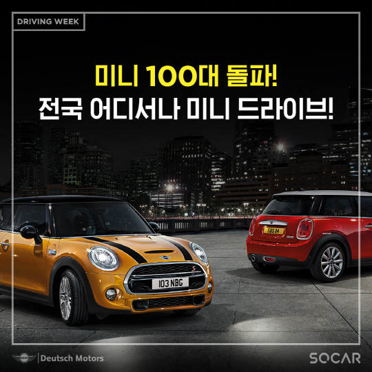 쏘카는 현재 경차부터 승합까지 다양한 차종을 서비스하고 있으나 미니는 카셰어링 주 이용층인 20~30대 남녀에게 특히 인기가 많아 대기예약 수요도 높은 편이다. 쏘카는 미니 100대 도입을 기념해 오는 11월 6일까지 쏘카에서 서비스 중인 미니쿠퍼, 미니 5도어를 최대 10% 할인해 제공한다.