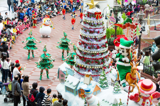 크리스마스 의상을 입은 로티, 로리와 캐릭터 친구들이 함께 여행을 떠나며 크리스마스 파티를 즐기는 '크리스마스 캐릭터 퍼레이드'는 올해 새롭게 선보이는 공연. 롯데월드의 다양한 캐릭터가 총 출동한다.
