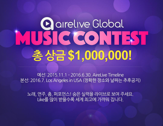영상 기반의 맞춤형 SNS 에어라이브(AireLive)가 총 상금 100만달러를 걸고 2016년 6월까지 '에어라이브 글로벌 뮤직 콘테스트(AireLive Global Music Contest : 이하 콘테스트)'를 개최한다고 밝혔다.