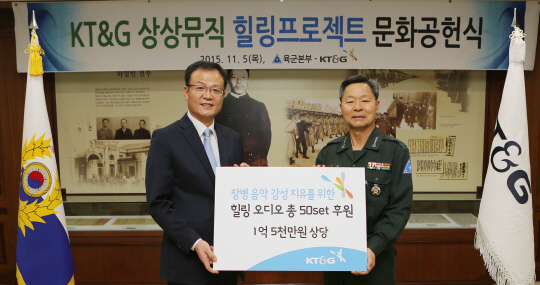 KT&G는 5일 충남 계룡시에 위치한 육군 본부에서 백복인 KT&G 사장과 장준규 육군참모총장이 참석한 가운데, 총 1억 5000만원 상당의 오디오 세트 전달식을 가졌다.