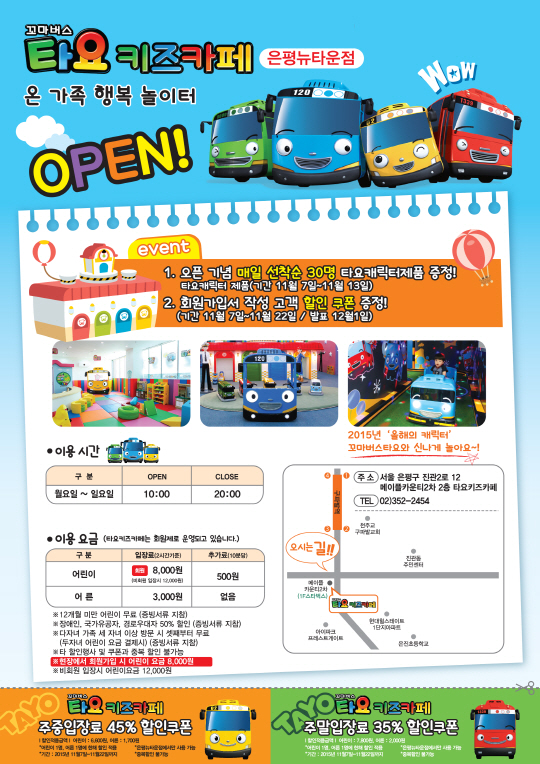 한편, 타요키즈카페는 은평뉴타운점 오픈을 기념해 내방 고객에게 타요 캐릭터 선물을 선착순 증정하고 회원가입서 작성 고객에게는 캐릭터 상품과 무료 초대권, 할인쿠폰 등을 선물로 제공한다.