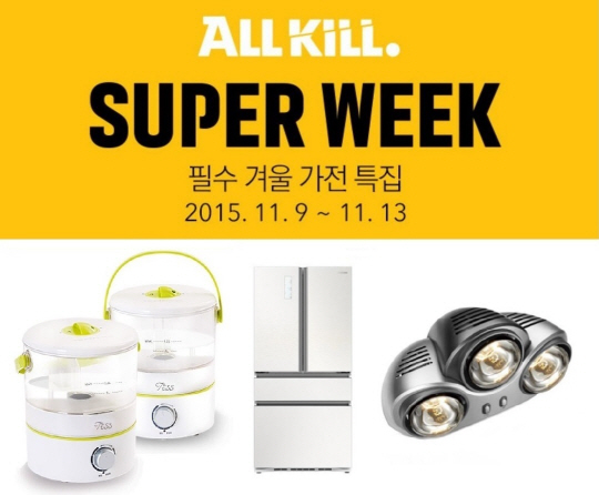 매일 오전 10시 인기 겨울가전 1개를 선정해 한정수량 특가 판매한다. 9일에는 겨울철 건조한 날씨를 위한 '테스(TESS) 아이사랑 가습기'를 3만9900원에 300대 한정 판매했다. 10일에는 본격적인 김장시즌을 맞아 '대유 위니아 16년형 딤채 김치냉장고 221리터'(65만9000원, 50대)를 선보이며, 11일 '16년형 삼원온스파 온수매트'(9만9000원, 300대), 12일 '삼성 지펠아삭 김치냉장고 508리터'(166만9000원, 50대), 13일 '욕실난방기 1초 히터'(6만9900원, 300대) 등이 준비됐다.