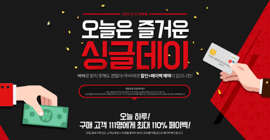 기간 동안 111명에게는 추첨을 통해 최대 110% 적립금을 돌려주는 페이백 이벤트도 진행한다. 1만1000원 이상 구매한 고객 100명에게는 1만1000원의 적립금, 10만원 이상 구매 고객 10명에게는 11만원, 100만원 이상 구매 고객 1명에게는 110만원의 적립금을 증정한다. AK플라자 백화점관 상품 1만원 이상 고객에게는 11% 할인 쿠폰을 증정하고, 선착순 1111명에게는 무료배송 쿠폰을 제공한다. 간편결제 시스템인 페이코(PAYCO)로 상품 결제시 아몬드 빼빼로 1111개를 100원에 한정 판매하고, KB국민카드 및 현대카드로 7만원 이상 구매시 5% 청구 할인 혜택을 제공한다.