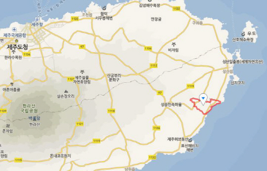 | 표시부분이 제주신공항 예정지로 발표된 성산읍 신산리. 출처=네이버 |