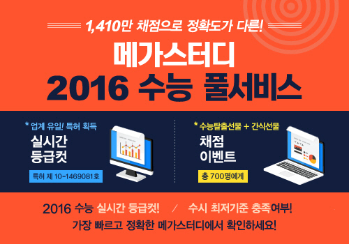 메가스터디교육의 고등부 사이트 메가스터디(www.megastudy.net)가 고3 수험생들을 대상으로 12일 저녁부터 온라인과 모바일을 통해 2016 수능 등급컷 풀서비스를 제공한다.