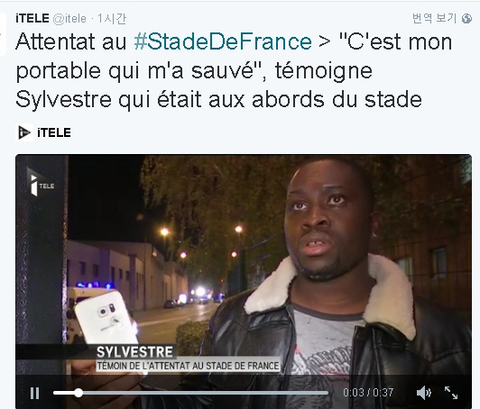이날 축구 A매치를 보기 위해 파리 북부 '스타드 드 프랑스' 경기장을 찾은 실베스트레(27)는 프랑스 i텔레 방송과의 인터뷰에서 "휴대폰이 나를 살렸다"고 식은 땀을 닦았다.