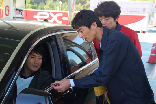 진주(부산방향)주유소를 찾은 한 고객이 가짜 유류 여부를 나타내는 '검사 키트'를 활용해 정품 휘발유임를 확인하고 있다.